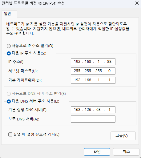 DNS 서버를 입력하지 않으면 내부 네트워크는 사용이 가능하나,
