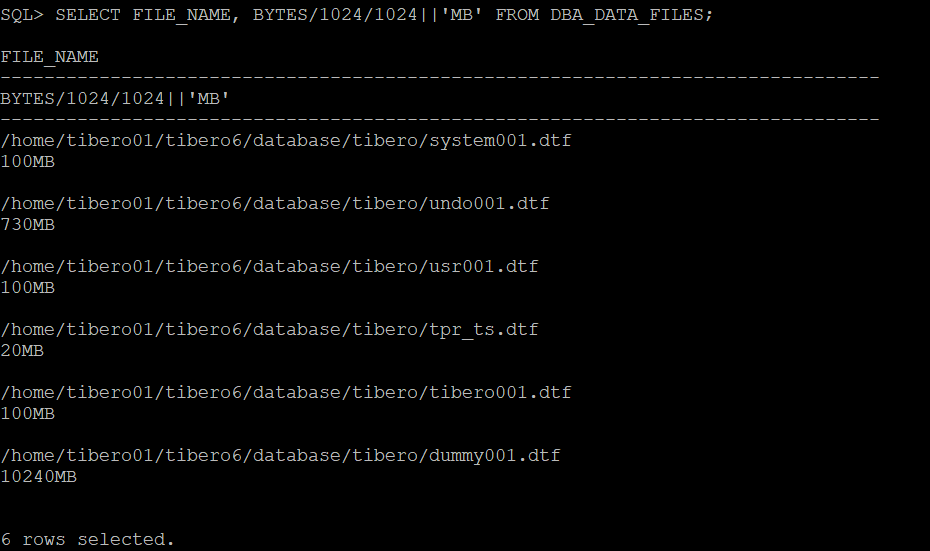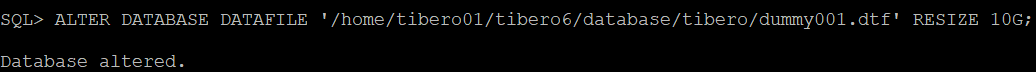 ALTER DATABASE DATAFILE '/home/tibero01/tibero6/database/tibero/dummy001.dtf' RESIZE 10G;