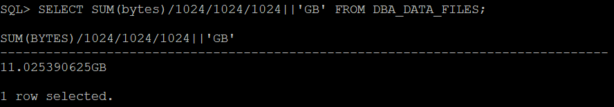SELECT SUM(bytes)/1024/1024/1024||'GB' FROM DBA_DATA_FILES;