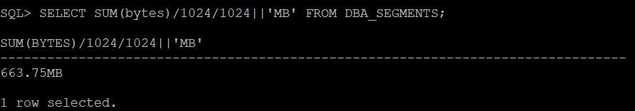 SELECT SUM(bytes)/1024/1024||'MB' FROM DBA_SEGMENTS;