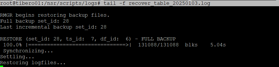 tbrmgr recover -w -p 8 --tablespace test01 -o /tibero_full_20250103114649 > /nsr/scripts/logs/recover_table.txt