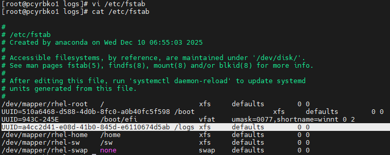UUID=a4cc2d41-e08d-41b0-845d-e6110674d5ab /logs xfs defaults 0 0